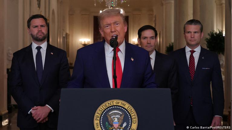 Pouco após o início dos ataques, o presidente dos Estados Unidos, Donald Trump, divulgou um vídeo de oito minutos nas redes sociais anunciando o início de “grandes operações de combate” contra o Irã. Em tom duro, Trump classificou o regime iraniano como “um grupo cruel de pessoas muito duras e terríveis” e afirmou que suas atividades nucleares e militares representam uma ameaça direta às tropas e à segurança dos EUA.